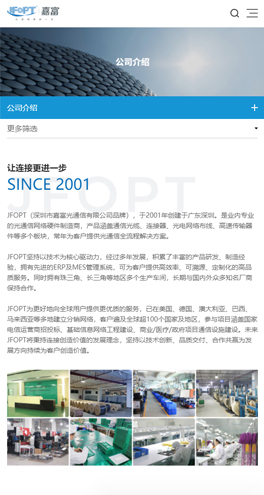 JFOPT(深圳市嘉富光通信有限公司品牌),于2001年創(chuàng)建于廣東深圳。是業(yè)內(nèi)專業(yè)的光通信網(wǎng)絡(luò)硬件制造商,產(chǎn)品涵蓋通信光纜、連接器、光電網(wǎng)絡(luò)布線、高速傳輸器件等多個(gè)板塊,常年為客戶提供光通信全流程解決方案。